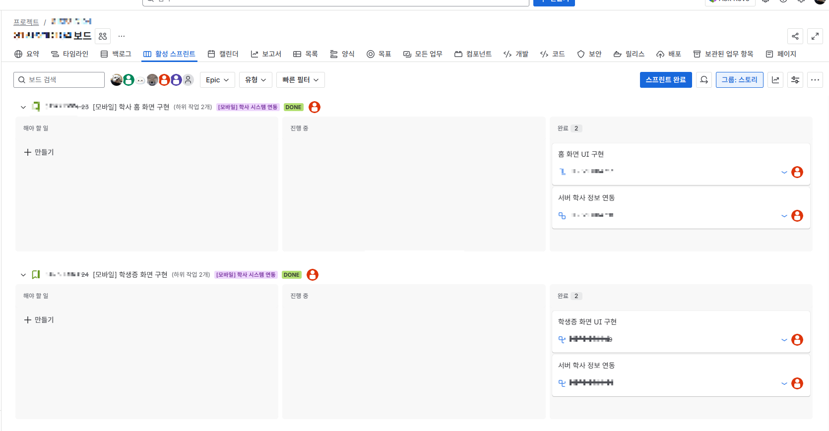 - Done (완료): 개발이 완료되어 코드 병합까지 끝난 이슈가 위치하는 곳입니다.